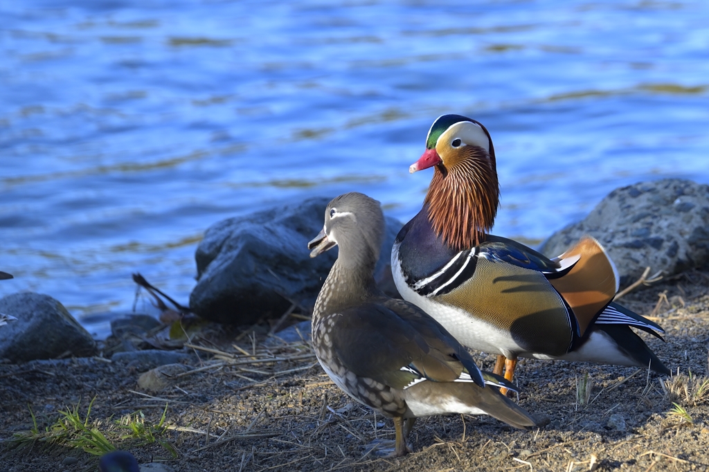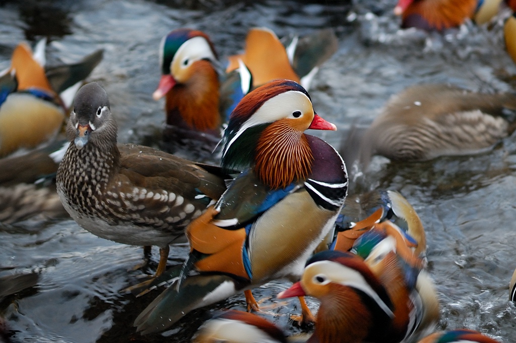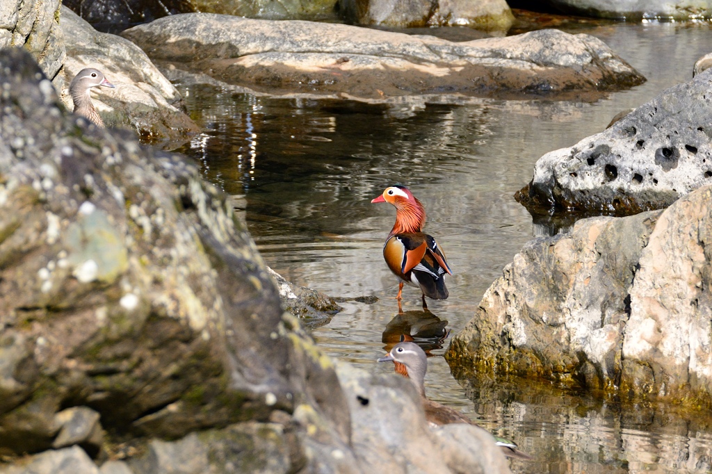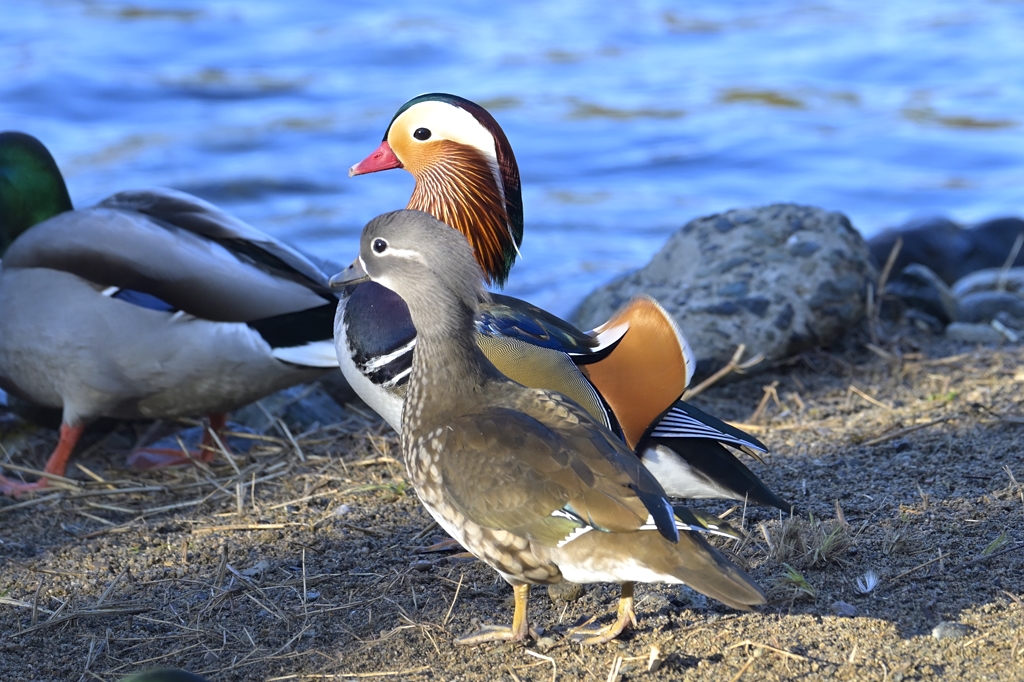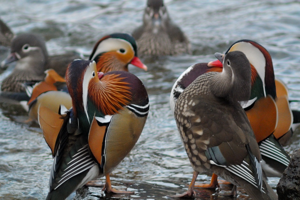 オシドリは非常に特徴的な姿、色目をしたカモの仲間です。国内のカモの中でも飛びぬけて派手目な姿をしていて、野鳥に詳しくない方にもポピュラーな存在ですし、丸っこくて可愛らしい姿から、水鳥のアイコン的な人気の鳥です。