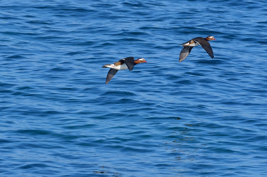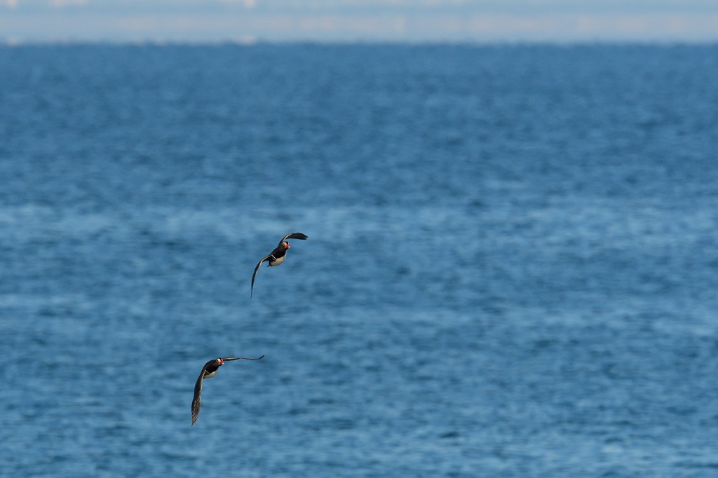 オシドリって池や川でじっと浮いているときはカラフルで明るい色目をしていますが、飛ぶと黒っぽさが目立つのですね。今まで飛んだところを見たことがなかったので全く想像していませんでした。このときはちょっとがっかりしつつ、ときが経った今は、珍しい「海のオシドリ」という絵が撮れたことにとても満足しています。