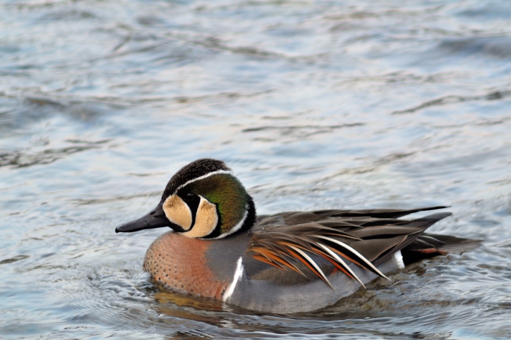 トモエガモは姿サイズがオシドリと同じくらいの小型のカモです。その名前の由来である緑と黒い縁取りの特徴的な顔で有名な水鳥ですが、オレンジ色をして垂れ下がる三次風切りの飾り羽根もとても綺麗です。