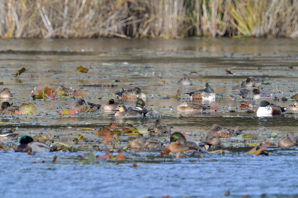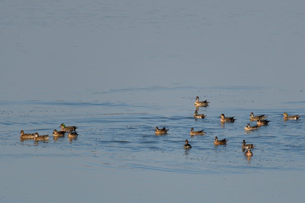 方々回ってやっとトモエガモを見つけられたものの、いかんせん距離が遠かった。。手前から、マガモ、ヨシガモ、オカヨシガモ、ヒドリガモ、コガモ、ハシビロガモといて、トモエガモは一番奥手です。ゴーヨンに1.4xでも米粒レベルな絵しか残せないため、禁断の奥の手、V1+ゴーヨン+1.4xという「換算1,900mm!」作戦でとにかく大きく写そうとした結果がこちらの絵です。