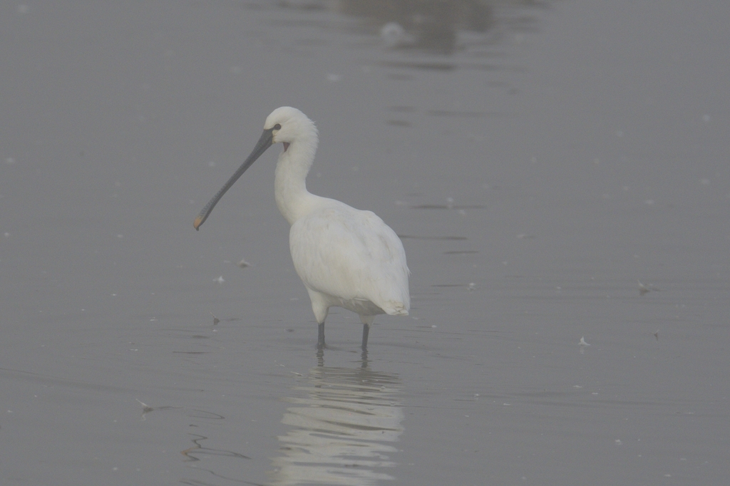 クロツラヘラサギとの違いは、まず目がどこにあるかわかるかどうかでしょうか。クロツラヘラサギはくちばしから額や目元まで黒色で目がどこにあるのかわかりにくいですが、ヘラサギは目が独立して現れているので、これが最大の見分け点となります。またヘラサギはクチバシ先端部が黄色くなるので、そこでもわかるかと思います。