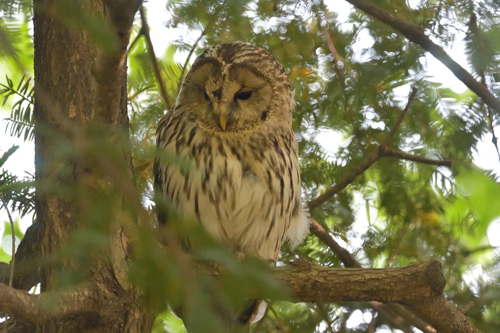 コロナもやっと一段落ついた2023年5月のGW、東京の街中の緑地公園に遊びに出かけました。鳥を見に行くというよりは、公園の近くに住む学生時代からの友人に会いに行くついでで寄ったのですが、思いもよらずフクロウに出会うことができました。聞くところによると、このフクロウ、去年もここにやってきていたとか。いったいここではどんな餌を食べているのでしょうか。街なので結構ねずみとか多いのかな?
