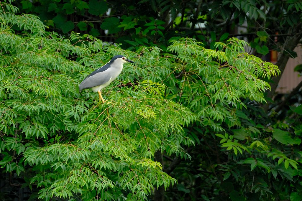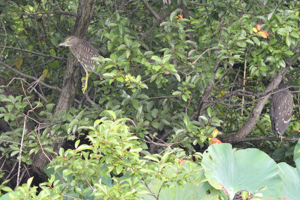 車で走っているとき、ゴイサギが繁殖している池をたまたま見つけました。1枚目は池の周囲にいた親です。繁殖場には昼でも普通にいますが、木や草に隠れていることが多いです。