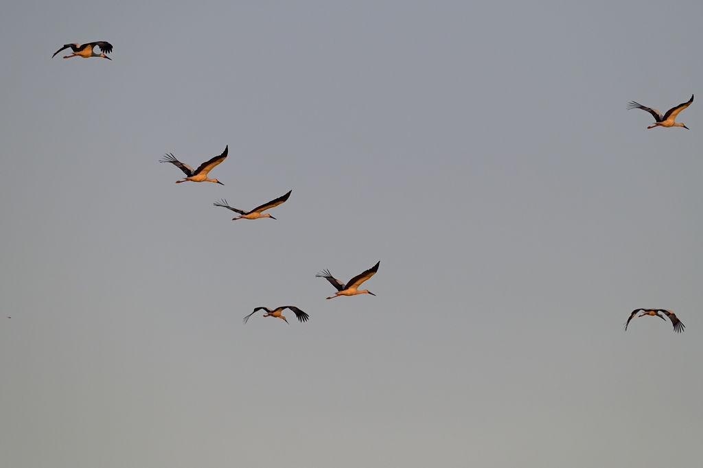 千葉県の利根川沿いで猛禽のねぐら入りを観察していたときの記録です。もう日も落ちかけて、帰り支度をしようかと思ったとき、上空を通り過ぎる大きな鳥の一団が目に入りました。サギかと思ったら飛翔姿の首が伸びています。大型の鳥で長い首を伸ばして飛ぶのはハクチョウ、ヘラサギ、コウノトリなどがいますが、ハクチョウは飛翔スピードがもっと速いですし、ヘラサギはこの辺に10羽もいるわけがありませんので、答えは自然と「コウノトリ」となります。