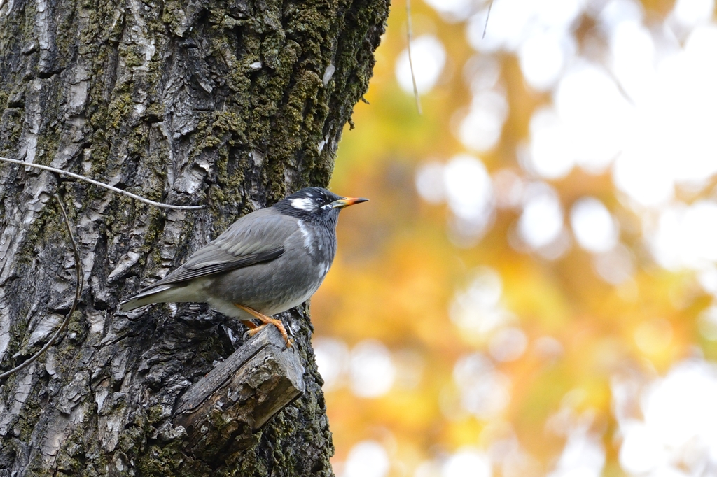 こちらも都内の公園で撮ったムクドリです。1名目の左が ♀ で、その右側のは若鳥だと思われます。♀ はのどから胸がグレーで、全体的にコントラストが弱い色目です。