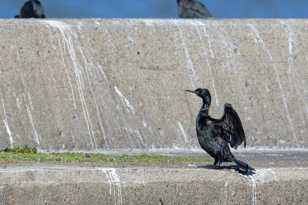 堤防で羽を乾かすヒメウです。緑色に光る羽根がきれいですね。