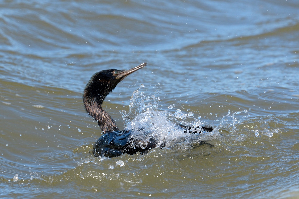 千葉県で見かけたヒメウ成鳥です。非繁殖羽なので、顔全体的に黒っぽく見えます。特にクチバシが細いのが特徴で、少し慣れればパッと見ただけでカワウやウミウと区別できるようになります。