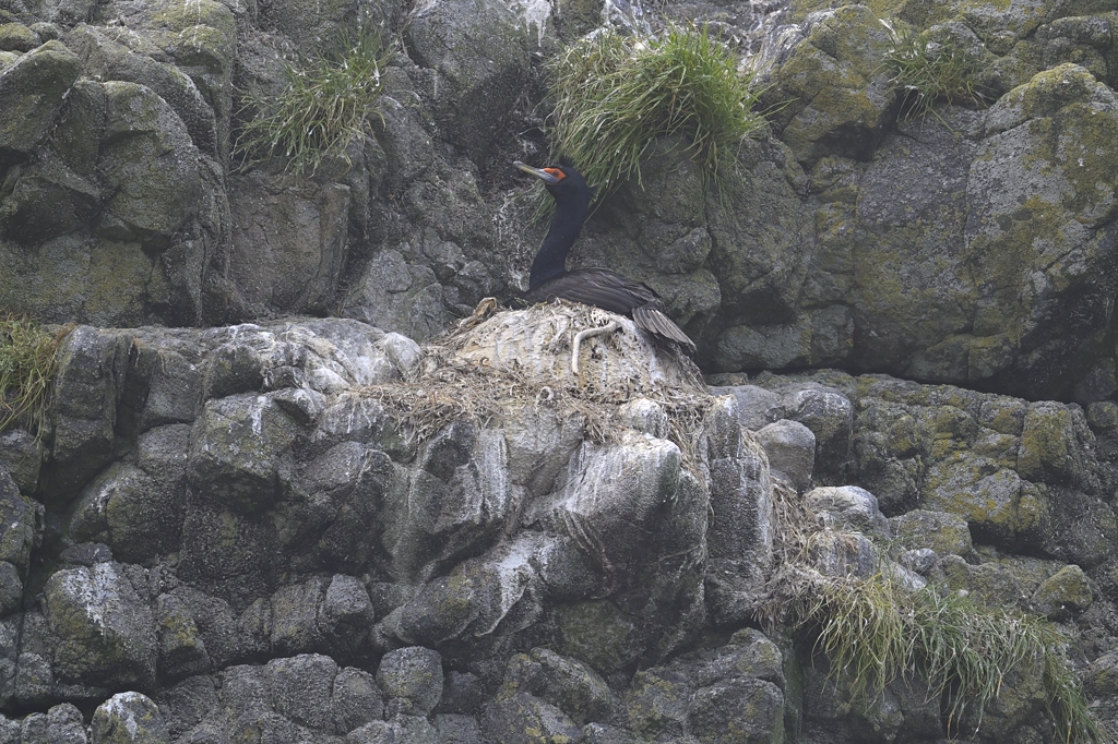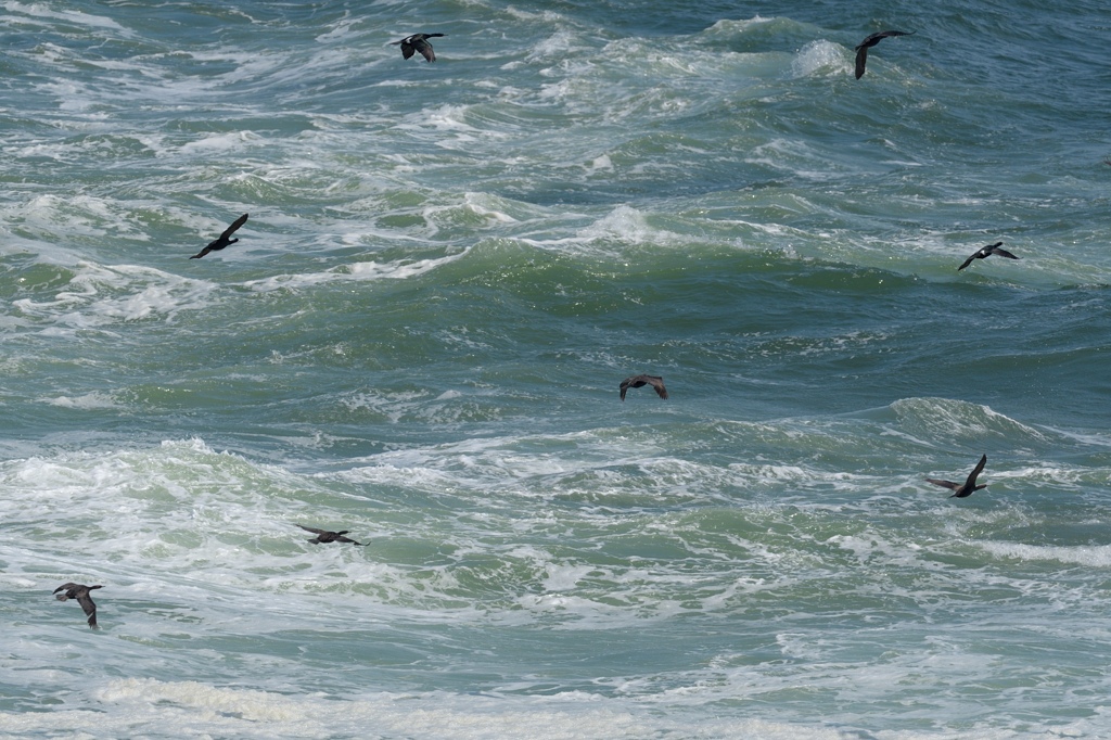 3枚目は群れで飛んでいるところ。関東で見るヒメウもウミウも、このように群れで飛ぶところは見たことがありません。カワウが群れで移動するのは見ますけれど、このように海面近くを乱舞するのはあまり記憶になく、やはり繁殖地ならでは光景なのかな?、と感じました。