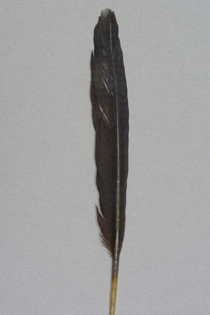 羽図鑑で調べてみたところ、どうやらヒメウの風切り羽根らしいとわかりました。最初はウミウかな?とか思っていましたが、サイズ的に大きな差があって合いません。確かに2024年の冬はこの突堤回りでヒメウをよく見ているので、可能性としても十分です。というわけで、この羽根がヒメウの風切り羽根である自信のほどは80%くらいかと思っています。ただ、少し艶が失われた状態で拾ったので、そこが惜しいところでしょうか。