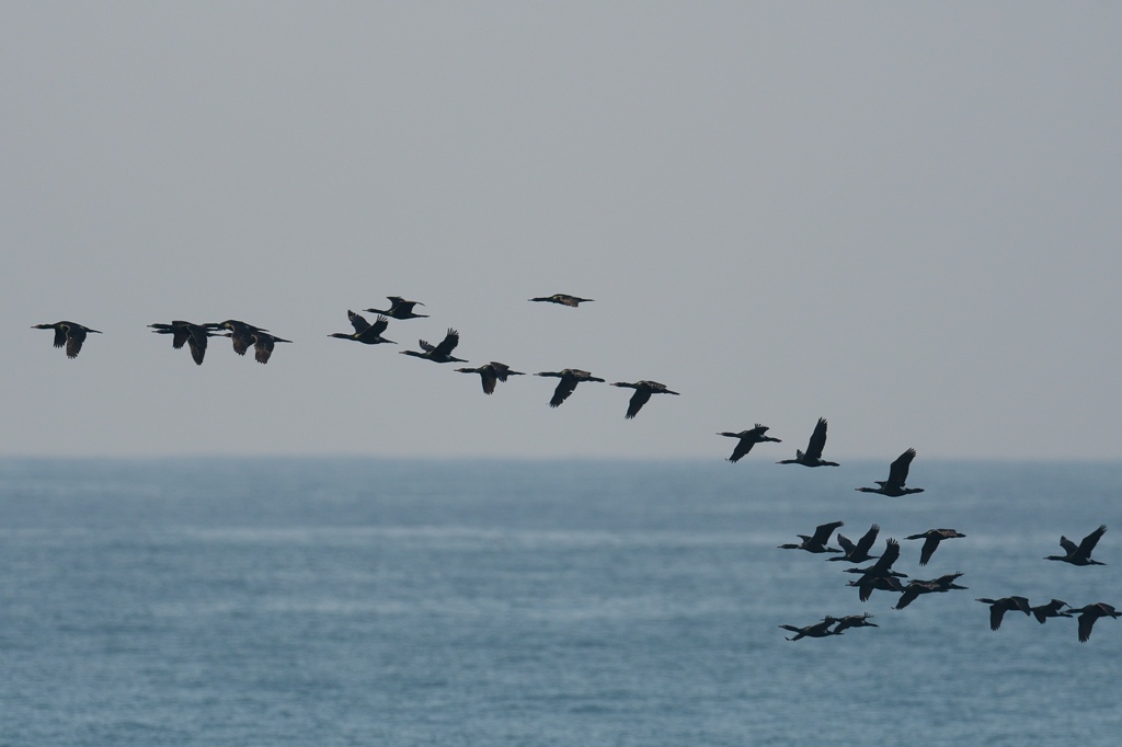 春の陽気の中、御前崎で海鳥観察をしていたところ、多くのウが東へ向かって移動していきます。おそらく北国へ向かう群れなのだと思われます。皆が陸から遠い距離を飛んでいくので、リアルタイムではこれが何ウなのか、よくわかっていませんでした。「たぶんまたウミウなんだろう」と思いつつ、家に戻って撮った画像をよくよく見直すと、写っている記録の大半が予想に反してヒメウでありました。ウミウも写ってはいたもののごく少数で、ヒメウの軍団を数えてみるとわずかな時間で100近い数が渡って行ったようです。