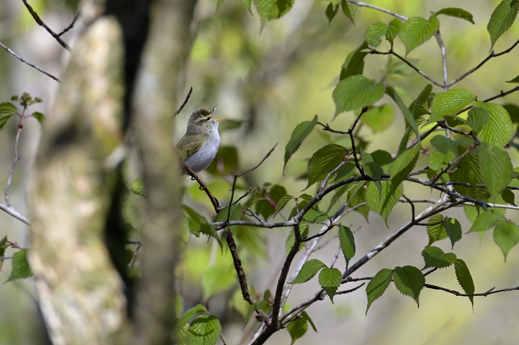 普段は木の枝の奥でちょこまか動いているのでなかなか姿を捉えにくい小鳥です。鳴きながらも移動するのでウグイスみたいな感じですが、ウグイスは草藪にもいるのに対して、センダイムシクイは森の木専門みたいなイメージです。