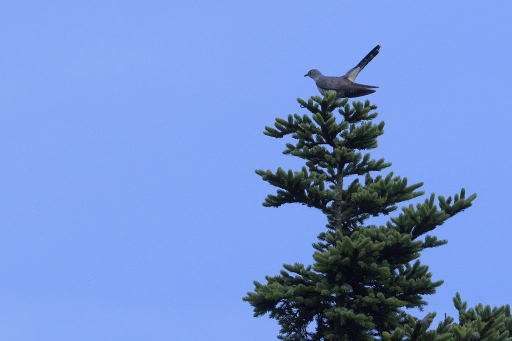 亜高山より高い高原で見ています。北海道は平地です。いれば「カッコウ!」という鳴き声が必ず聞こえますし、高い木の天辺にいるので見つけるのも割と簡単です。そしてしばらくは一か所で鳴き続けるので、あとは頑張って鳴き声の方に向かって探しにいくだけです。ただ湿原などでは歩くルートが限られていたりするので、「見つかっても近づくことができずに、結局遠い豆粒で終了」というパターンが多いですね。
