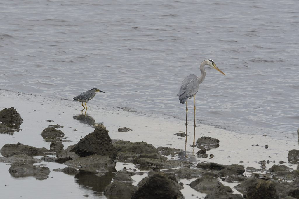 ササゴイのサイズ感がわかるようにアオサギと一緒に写っているところを一枚紹介しておきます。
