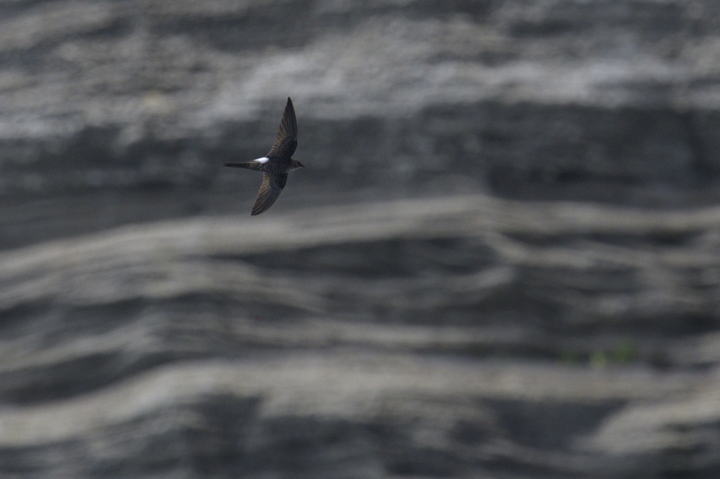 アマツバメは断崖の隙間などで繁殖を行います。生涯を通じて平らなところに止まる(枝も含め)のは苦手という面白い鳥です。断崖沿いに飛ぶと保護色になっていることがわかります。