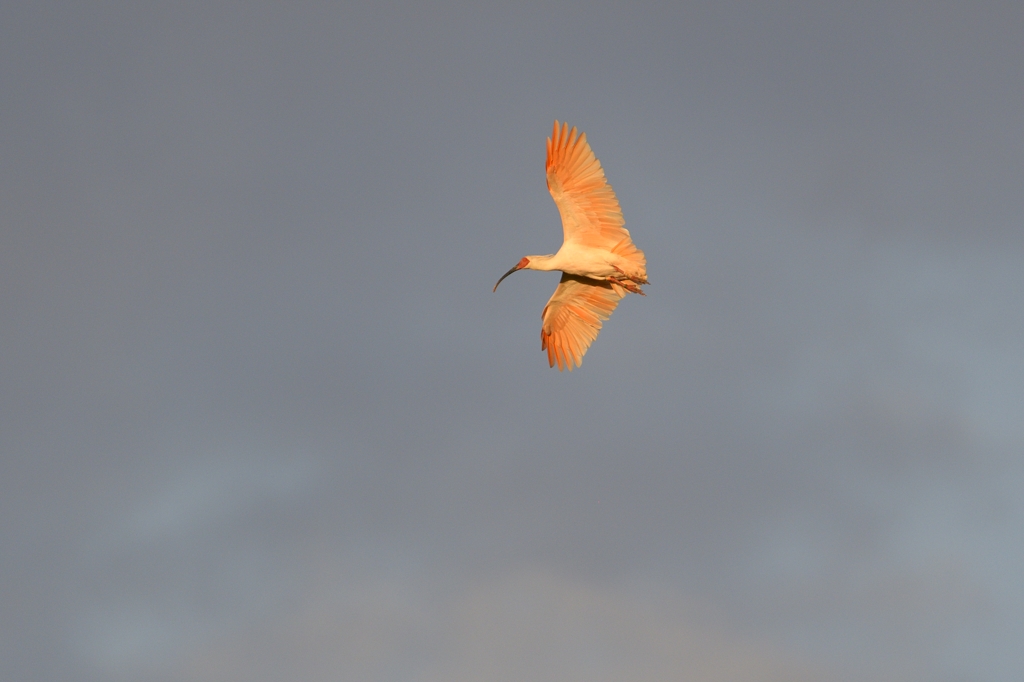 トキを観察するならやはり飛翔姿からがお勧めです。個人的には、繁殖期が終わってシンプルな朱鷺色となった冬羽姿が好きです。(夏羽姿は身体が黒色に染まるので、自分は観察行に秋を選びました)