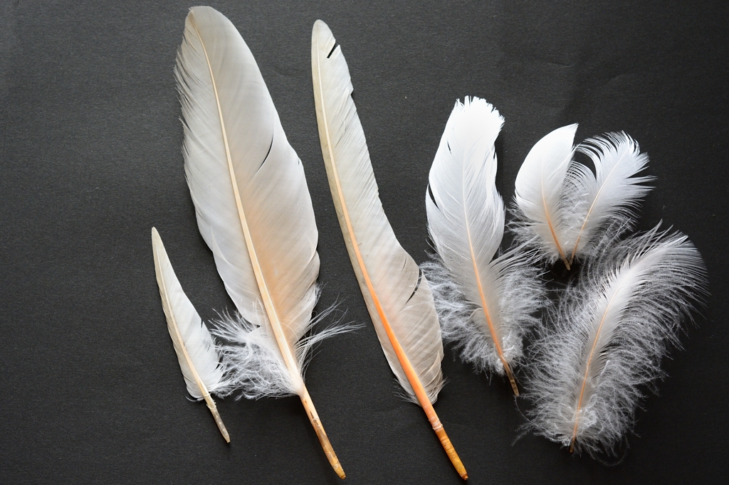 佐渡に入って二日目の晩、天気がかなり荒れました。翌朝、全てのトキたちがねぐらから飛び立つのを観察した後、ねぐらの周囲を歩いてみると、トキの羽根が結構な数見つかりました。前日の風雨で抜けた羽根が周囲に飛んでいたようで非常にラッキーでした。雨に濡れたものが多かったので、宿で水洗いして持ち帰りました。