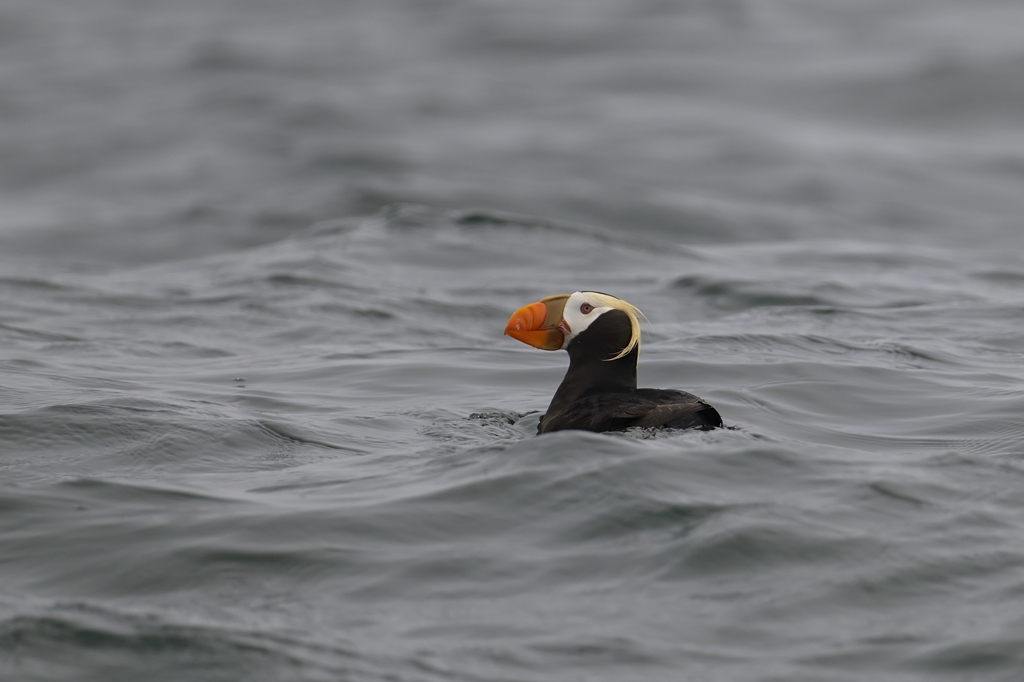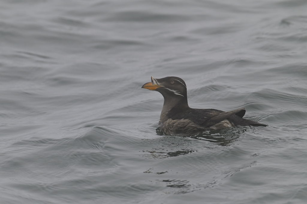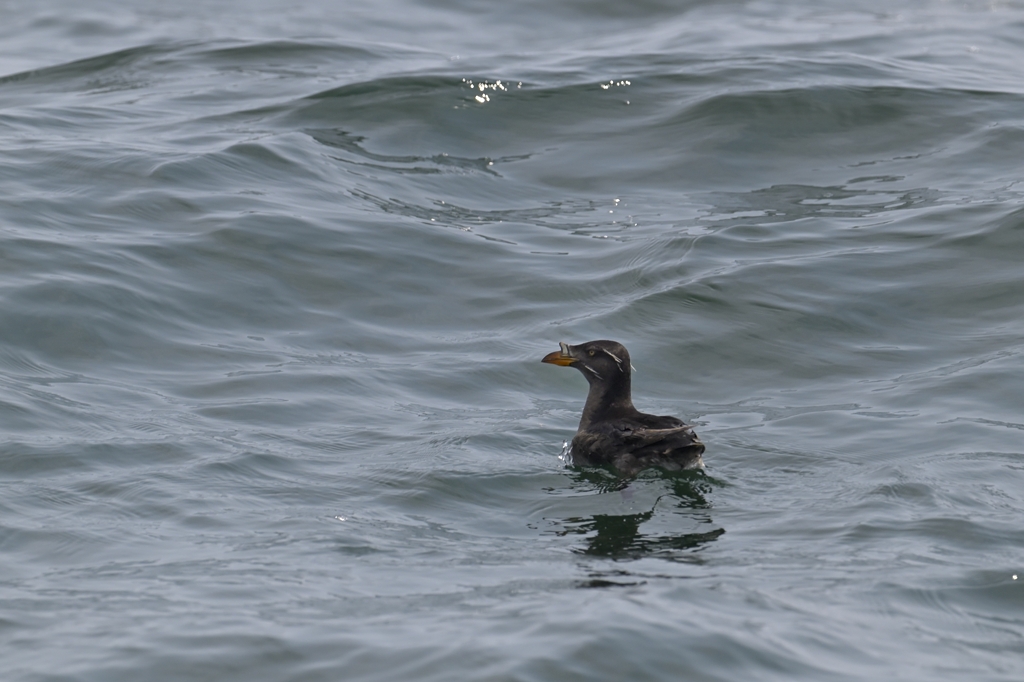 このように観察専用船だけでなく、フェリーでも見られる鳥なので、観察のチャンスはそこそこ多い海鳥な印象です。なにより見た目が面白いので何度見ても嬉しい。一方で波間に浮かぶ鳥なので、図鑑のようなきれいな絵に残すのは中々難しいです。出会いのシチュエーションとして鳥との間に隠れる場所がありませんし、船が50mより近づくとさすがに飛んで逃げられます。そんな距離感がよけいに好奇心を持たせてくれるのかもしれませんね。また観察の機会を是非持ちたいものです。