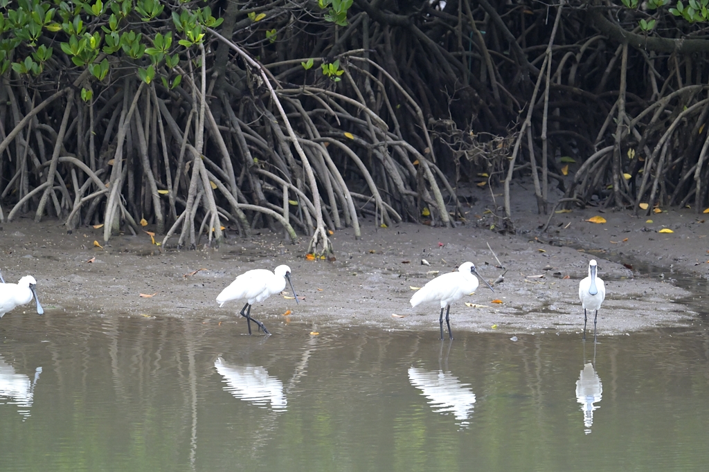マングローブ林の前に並んだクロツラさんたち。当日は5羽ほどの小群れで見えました。飛んできたところを写せなかったのは残念。目視した「大きく真っ白な翼を広げた飛翔姿」はとても美しかったので、また次の機会を作りたいものです。