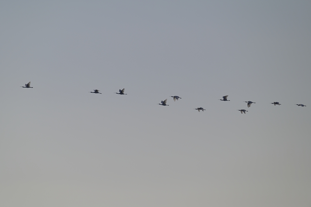 3度目の出会いでやっとクロツラヘラサギの飛翔絵を残すことができました。満潮が近づくにつ入れて、沖にいた群れから順に陸に向かって飛んでくれたので、撮影に良い場所を選びつつ、じっくりと観察することができました。とても満足な一日となりました。