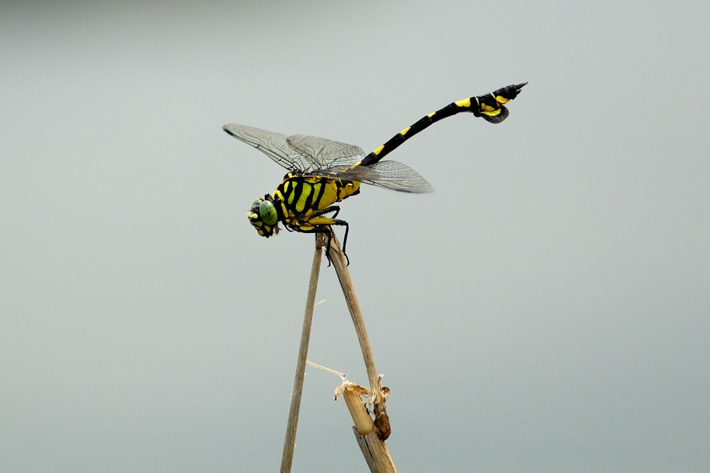 ギンヤンマがこの絵のように単独で草木に止まっている姿を見るのはかなり稀です。