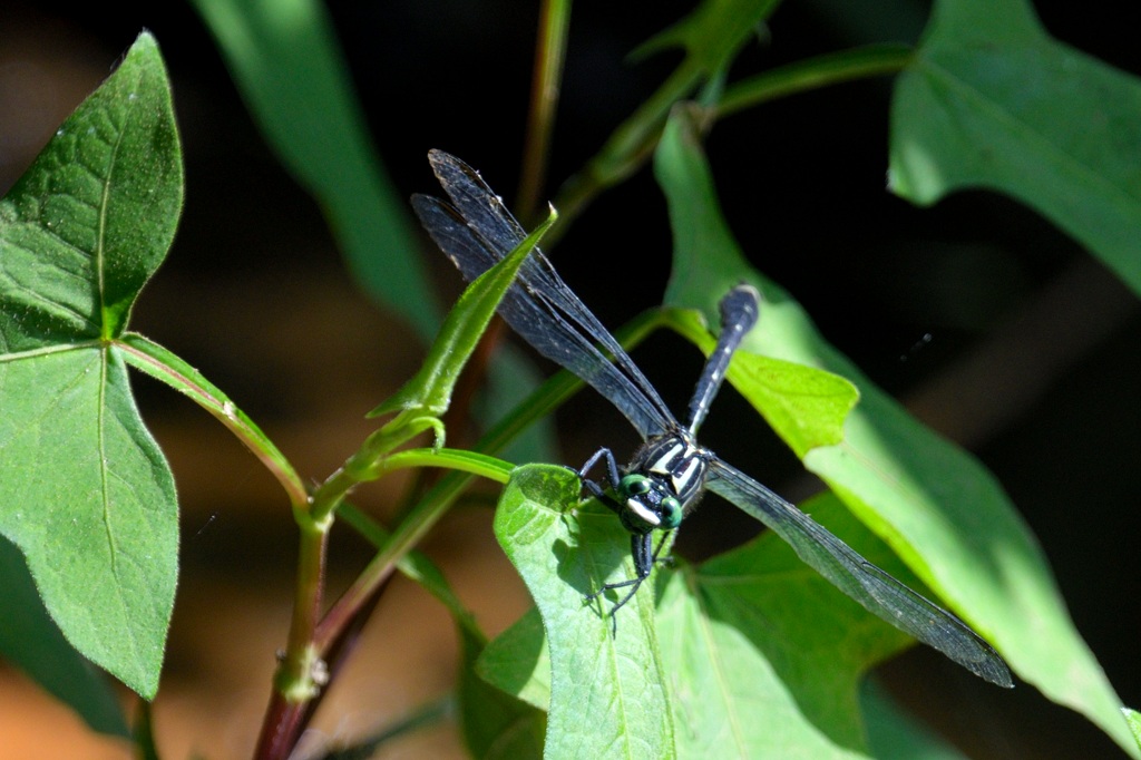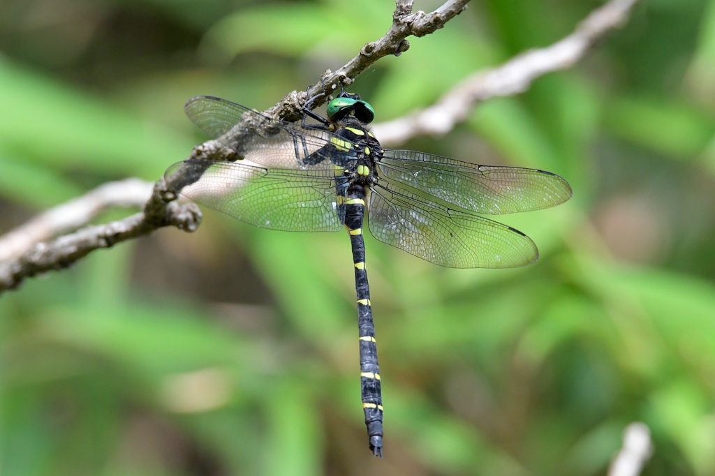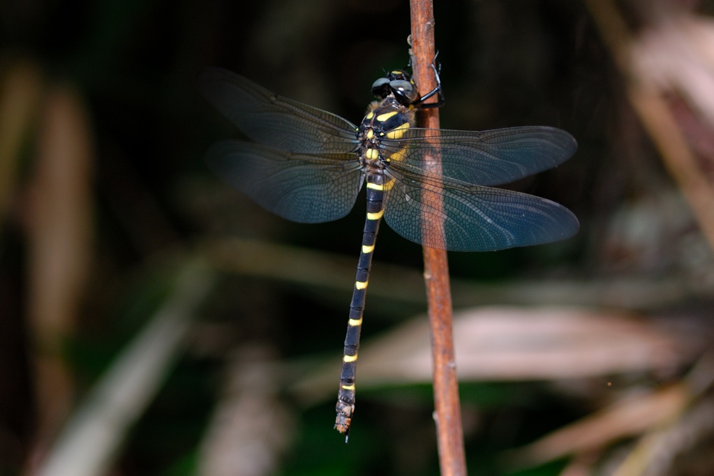 私の記録では福山市と新潟の十日町市の2か所で観察記録があります。福山では4度ほど記録があるので、個人的にはそれほど珍しいトンボというイメージはありません。また動きが非常にどんくさいので、観察は容易です。人間がいても意に介さず、そもそもがノソノソとした飛び方ですし、草木に止まるのさえ下手くそで、少し横から風が吹くと必死でしがみついている感がもの凄く感じられます。胴体が太くて大きいので身体も重く、俊敏性には欠けるのでしょうね。