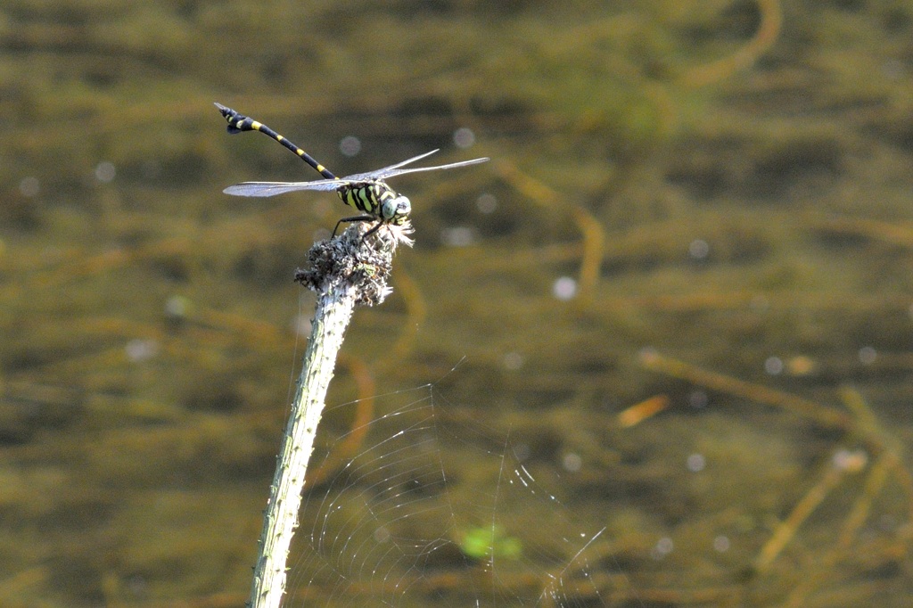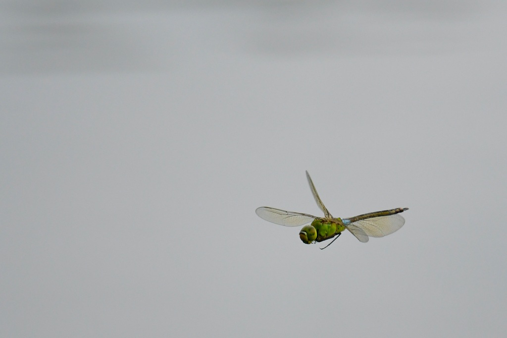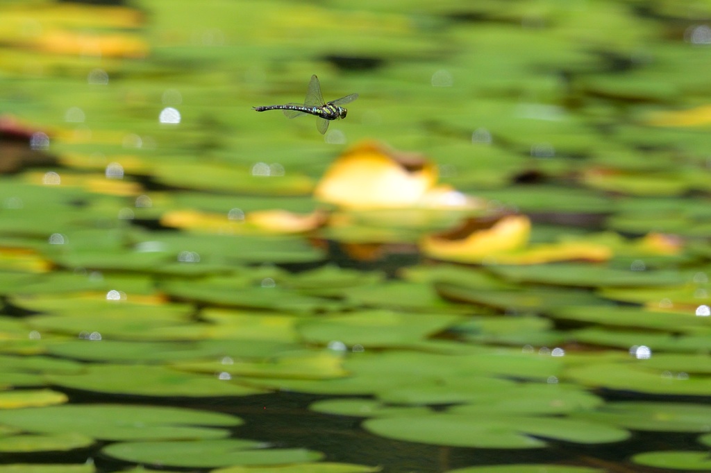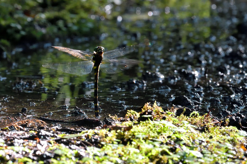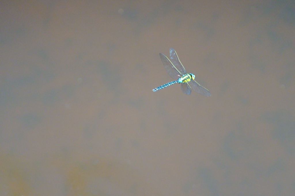オニヤンマは産卵のとき泥まで産卵管を差し込んで産卵するので、数十センチ上空で上を向いてホバリングしながら、「ズボ!」という感じで着水して産卵し、すぐにまたホバリングに戻り。。ということを繰り返します。こういう状況ですと私のような腕の足りないカメラマンでも落ち着いてマニュアルフォーカスできるので、飛翔写真の練習にはもってこいなトンボです(ただし産卵中の ♀ に限ります)。
