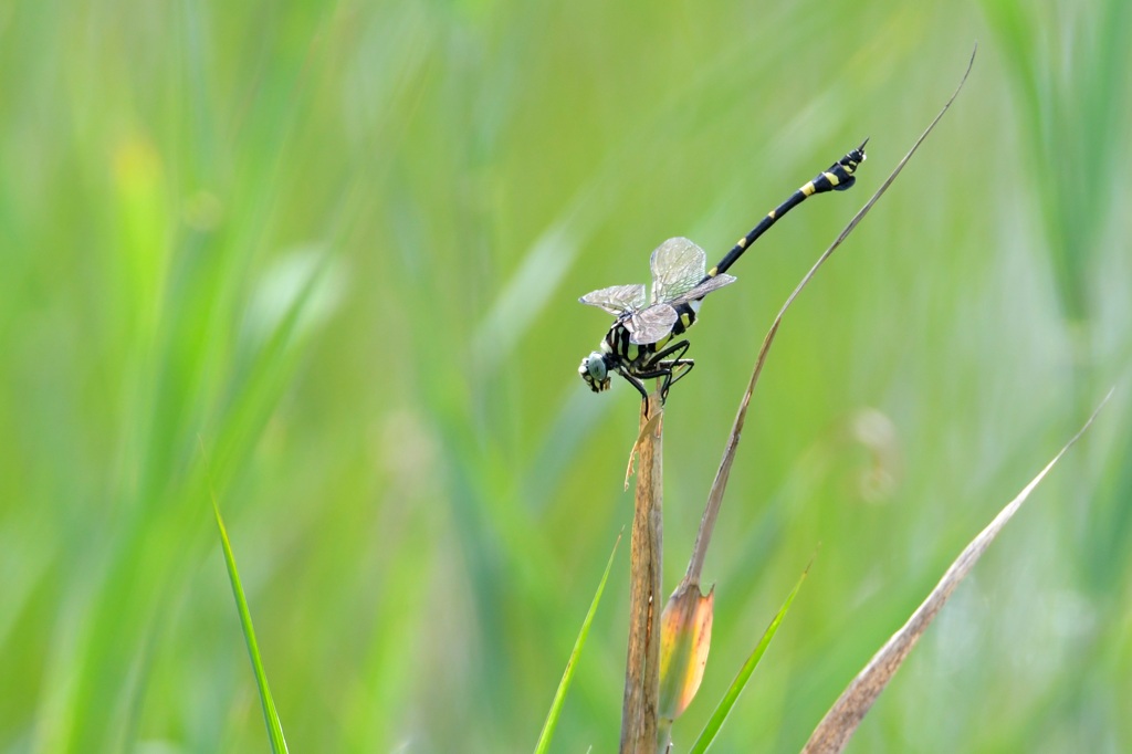 両種ともコサナエ属であり、私が観察した福山のホームグラウンドではタベサナエ含めてコサナエ属の3種が共存しているようです。小鳥も近い種が同じ場所に居たりするものですけど、トンボなどはその地で繁殖しているものが多いわけなので、いったいどういう棲み分けなのか、いつも不思議に思います。