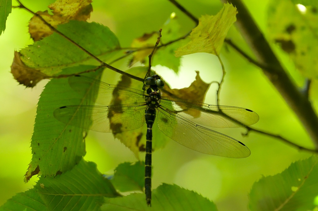 一方、オニヤンマは”真夏”の印象が一番強いトンボです。私のオニヤンマの撮影記録は6回あって、7月2日~9月7日の間にあります。セミの声がシャワーのごとく降り注ぐ山の中、日差しも強く蒸し暑い環境にぐったり。我慢できなくなって日陰でしばしの休憩をしていたら、オニヤンマの巡回に遭遇した。みたいななシチュエーションですね。もっと言うと、暑いのを我慢して鳥見に出かけたところ、肝心の鳥には振られつつもオニヤンマに慰めてもらった。というのが典型的なパターンである気がします。