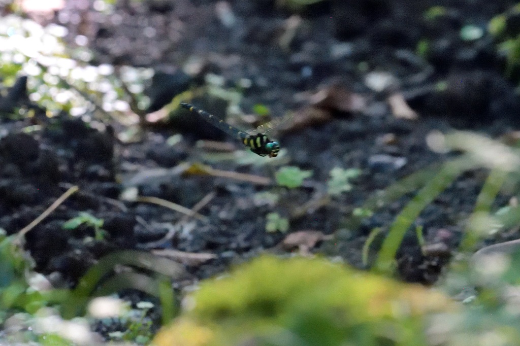 この時期はだいたい富士山周辺の水場へ出かけます。今回紹介するオニヤンマはそんな清水が湧き出る山の中で撮りました。木々で薄暗い中に木漏れ日が入るような場所で、清水が浅い川みたいにじわじわと流れているという、オニヤンマの紹介書にあるとおりの環境な場所です。福山ではオニヤンマはほぼ単独でしか見かけませんでしたが、ここはそんな理想的な場所ゆえか、沸いたようにたくさんのオニヤンマがいました。ちょくちょくバトルも発生して、賑やかな感じでした。