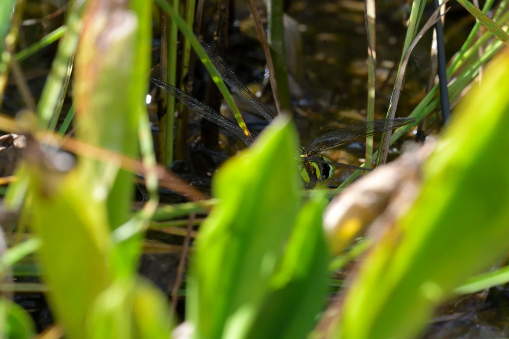 ルリボシヤンマの ♀ が産卵のため水草の根もとに降りたところです。残念ながら腹回りは草に隠れてしまいました。