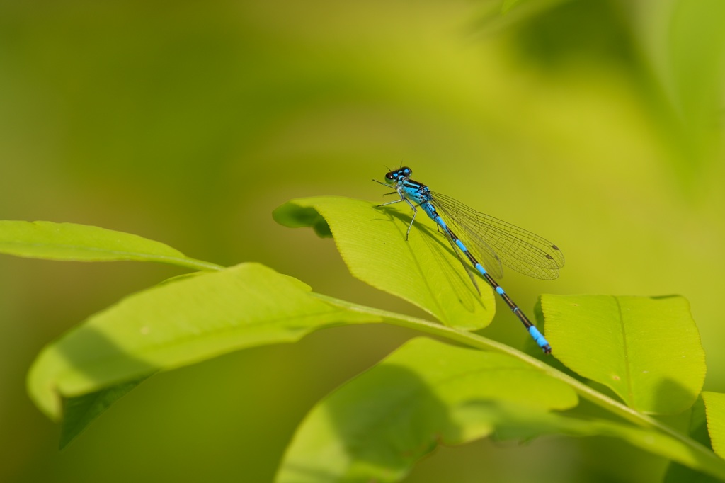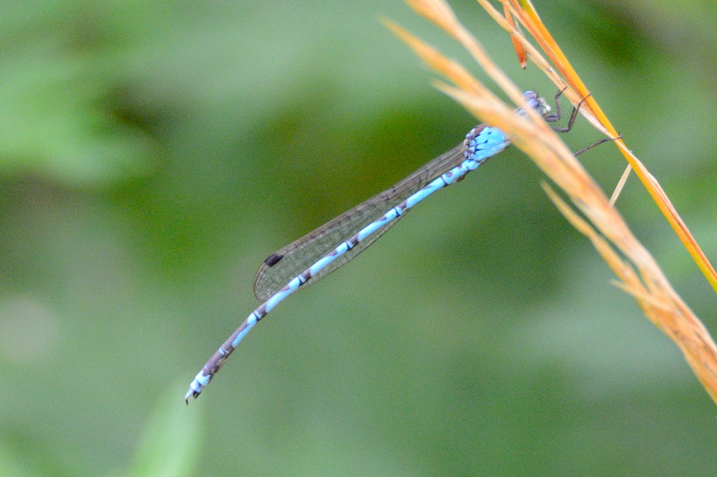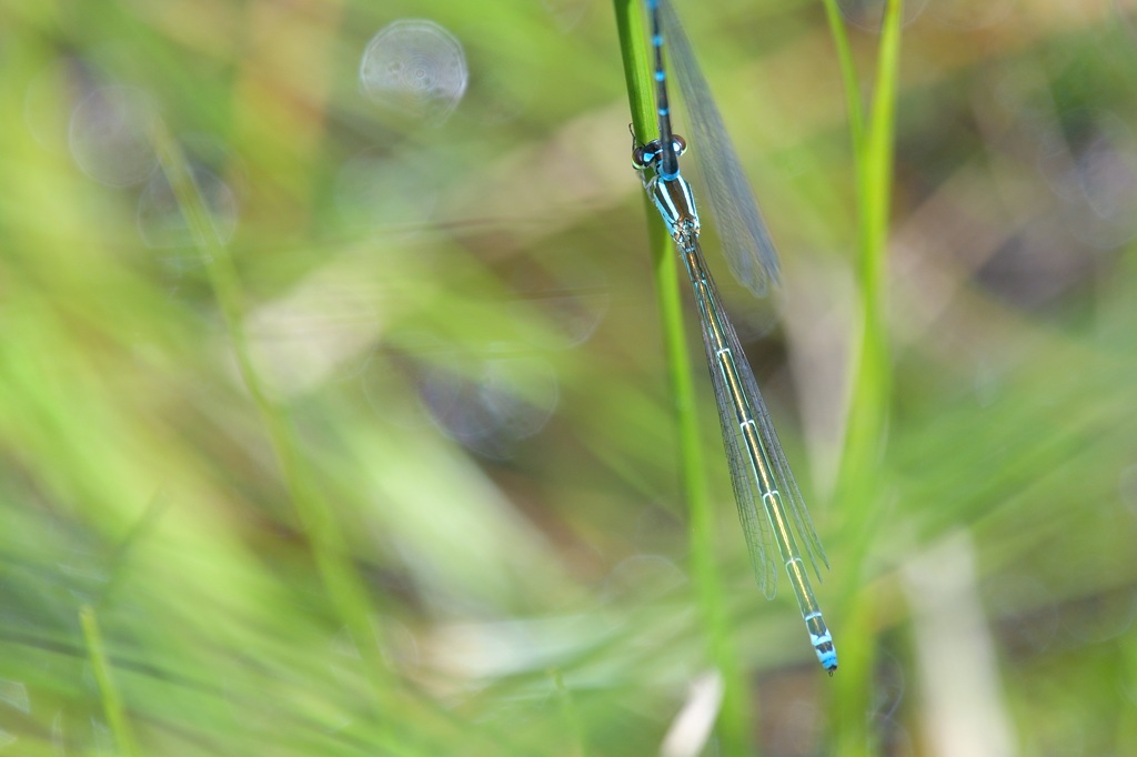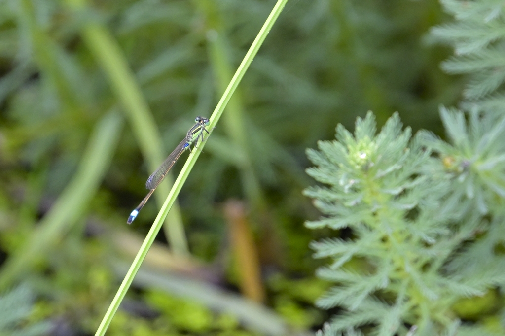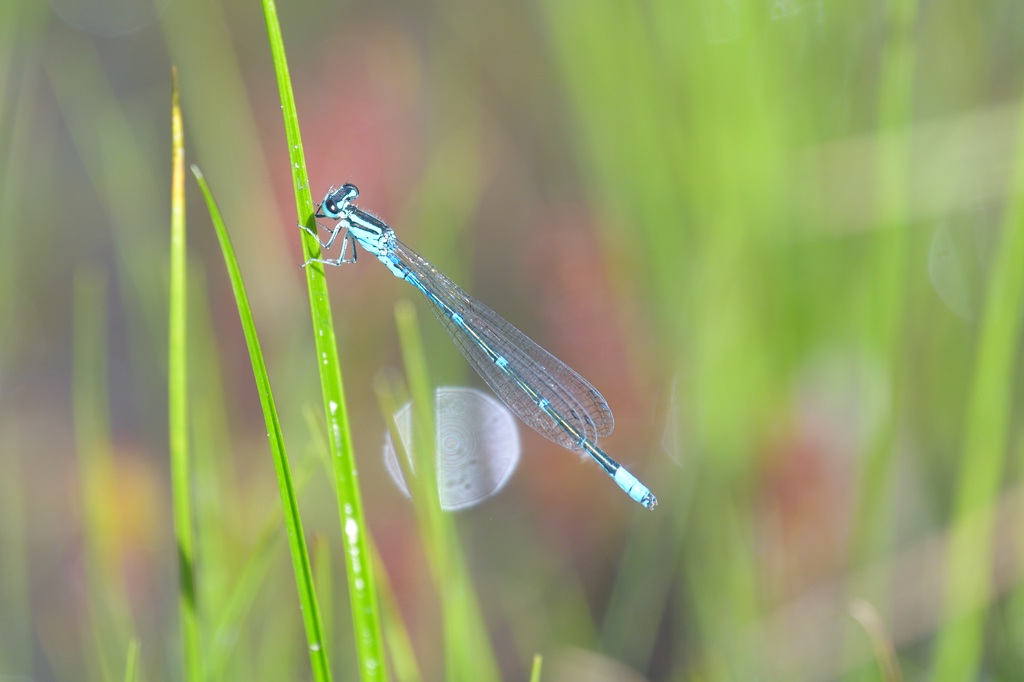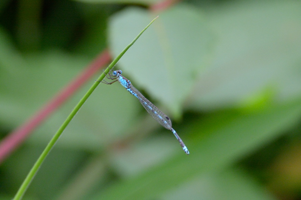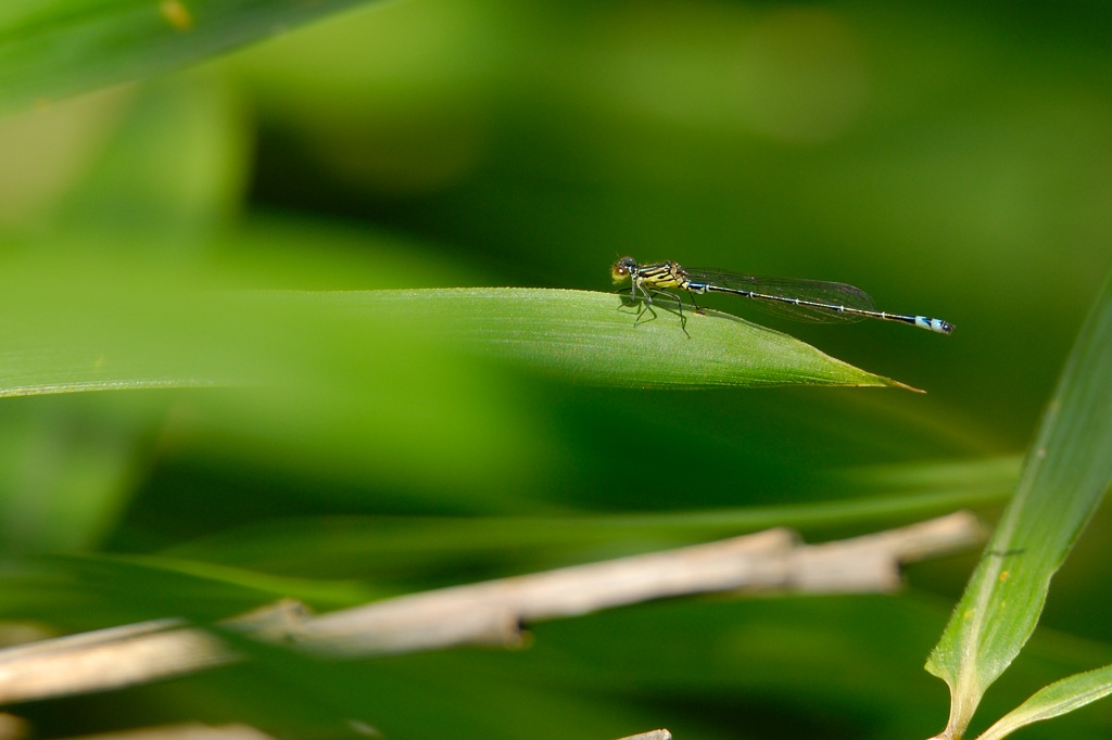 そんなとき唯一目印になるのが腹先端にある水色のワンポイントです。ファインダー像がぼけていても、なんとなく水色の点が見えればそこを頼りにフォーカスを合わせる感じでしょうか。マクロに近い近距離撮影では、わずかにフォーカスがずれるだけで、被写体が大きくぼけてしまうので、アジアイトトンボの撮影は撮る前のファインダー操作がまずもって難しいと感じました。