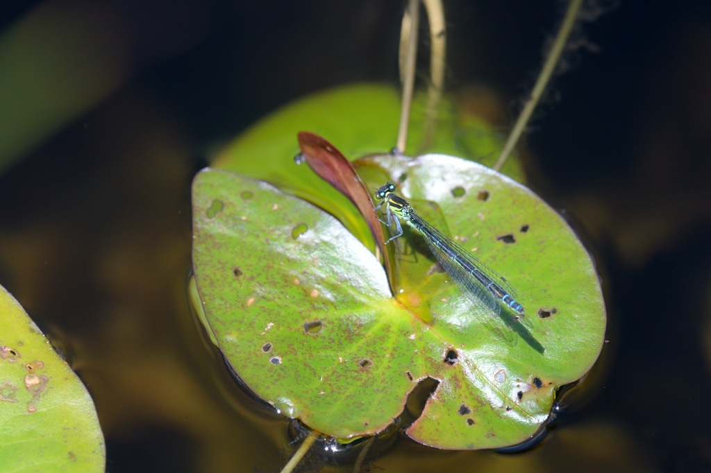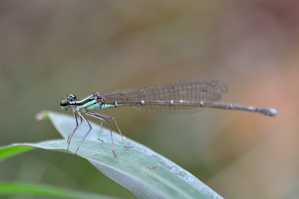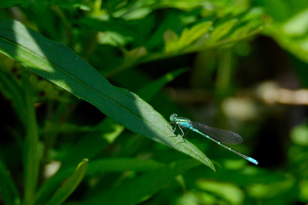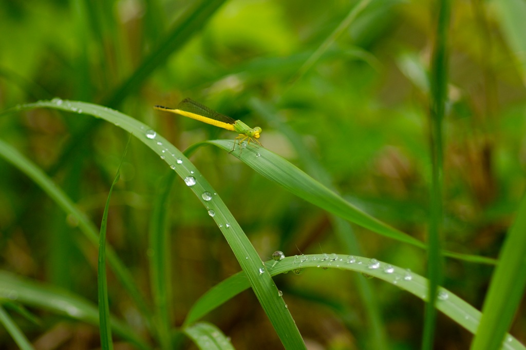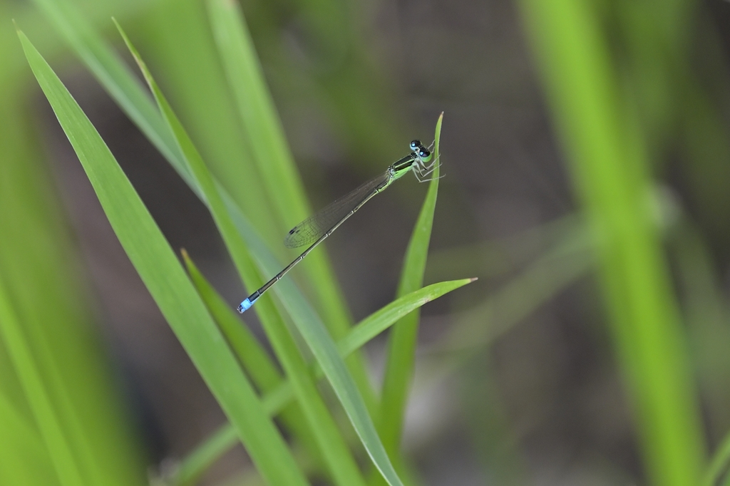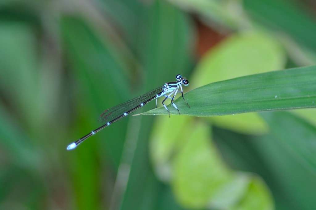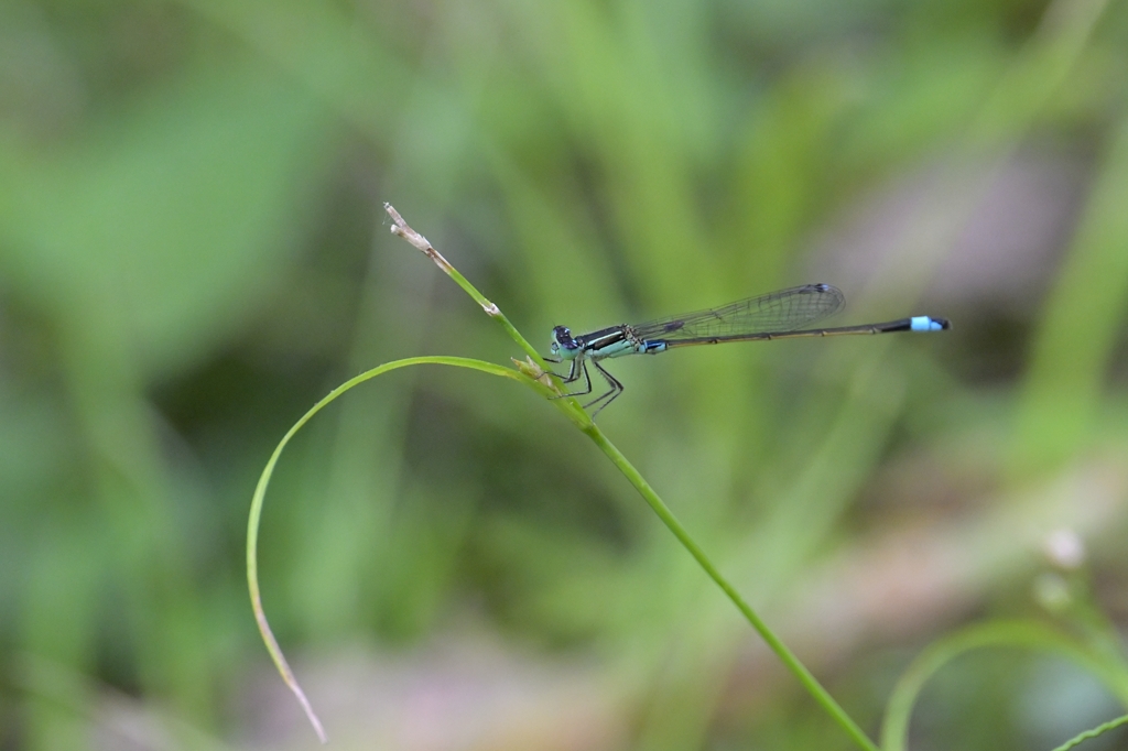 そんなとき唯一目印になるのが腹先端にある水色のワンポイントです。ファインダー像がぼけていても、なんとなく水色の点が見えればそこを頼りにフォーカスを合わせる感じでしょうか。マクロに近い近距離撮影では、わずかにフォーカスがずれるだけで、被写体が大きくぼけてしまうので、アジアイトトンボの撮影は撮る前のファインダー操作がまずもって難しいと感じました。