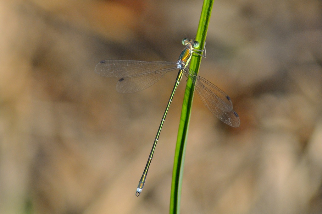 里山の谷戸にある水辺に秋のトンボを探しに行ったところ、足元にかすかな揺らぎを感じました。あらためて目を凝らすと、枯草色をしたかなり細いイトトンボが見つかりました。おそらく初めてみるトンボのようす。自分の知識の中では「オツネントンボの越冬前の姿かな?」と思って色々な方向から姿を記録しておきました。