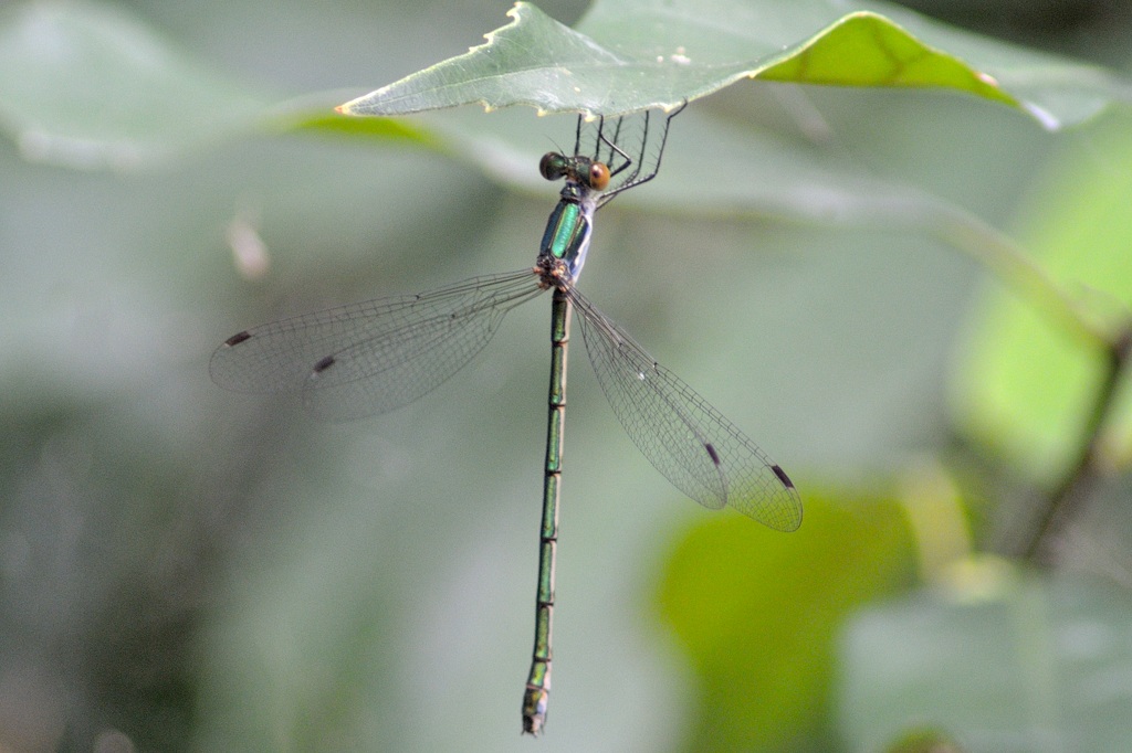 アオイトトンボの仲間は翅を半開きにして草木に止まるので、他のイトトンボと間違うことはまずありません。とはいえ、たまに翅を閉じたオオアオイトトンボを見ることがあるので全部が全部ではありませんが、基本的にこの翅の開きで「アオイトトンボ系だな」と分かると思います。