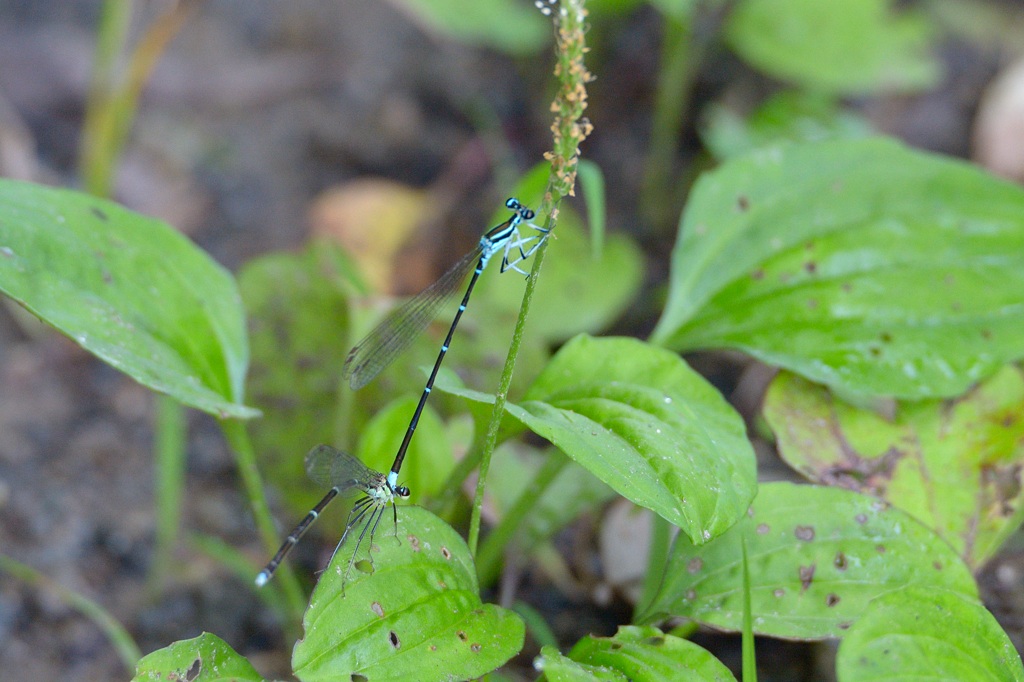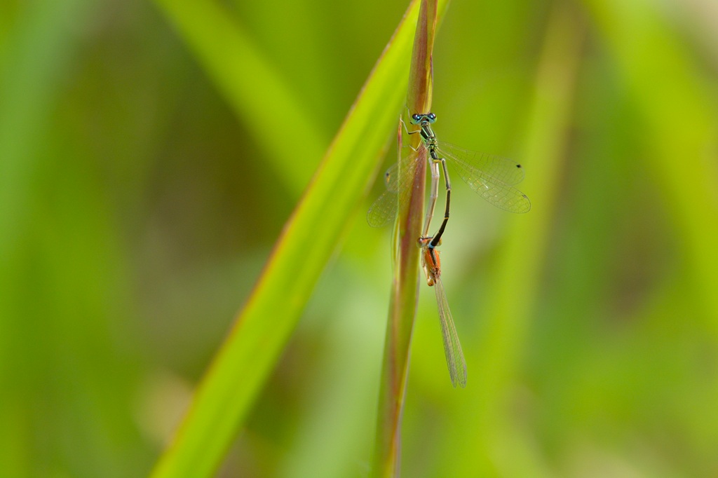 図鑑によると、胴の部分が赤色をしたアジアイトトンボ ♀ は未成熟体なのだそうです。成熟すると緑になるのだとか。しかしこの個体は赤いままで連結しています。おませさんなのでしょうか。