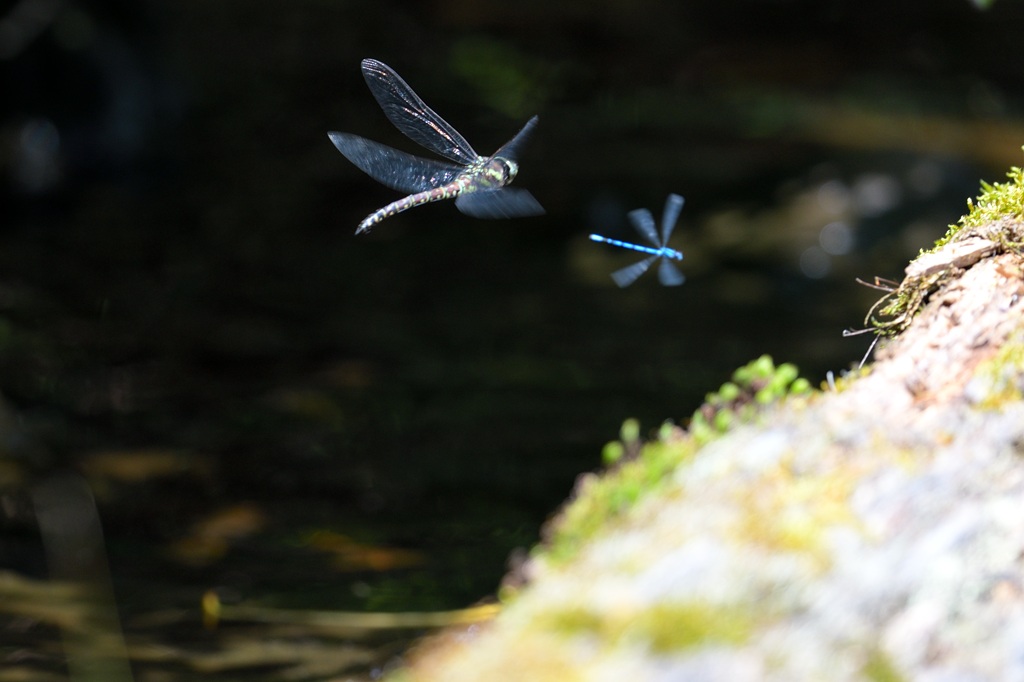 一つ上の写真と同じ高地で撮ったルリイトトンボの飛翔絵です。一緒に写っているのはオオルリボシヤンマの ♂ で、どちらかというとこっちにフォーカスは当たっていますが、逆に絵が滲んだ分、ルリイトトンボの輝きが強調された感じにも見えるので、「まあいいか」とこちらに貼らせてもらいました。
