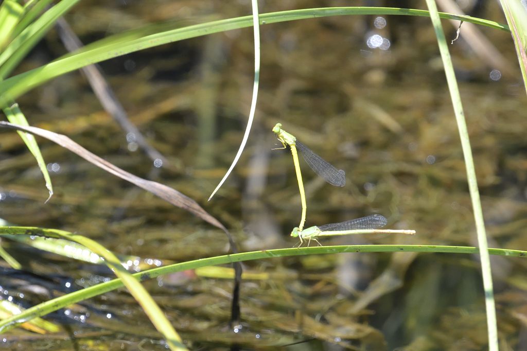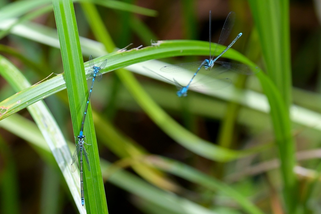 オゼイトトンボのペアです。丁度他のペアが飛んできて、♂ が驚いて羽を立てている様子が見えます。