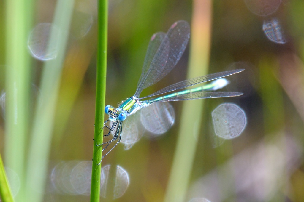アオイトトンボの青い目は宝石のように美しいです。