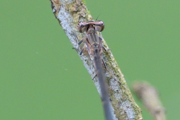 この日は ♀ 個体を単独で見つけられなかったので、この絵が唯一の ♀ の記録となっています。こちらの ♀ 個体は全身が枯葉色系の地味な感じですが、図鑑によるとオス風に青っぽい姿の ♀ もいるそうです。私はこの日までアオモンイトトンボとの出会いがなかったのわけですが、図鑑では「国内で最も一般的なイトトンボの一種」とあるので、また他の場所でも期待して探してみたいと思います。