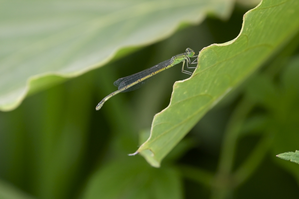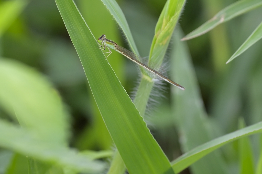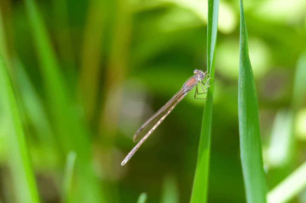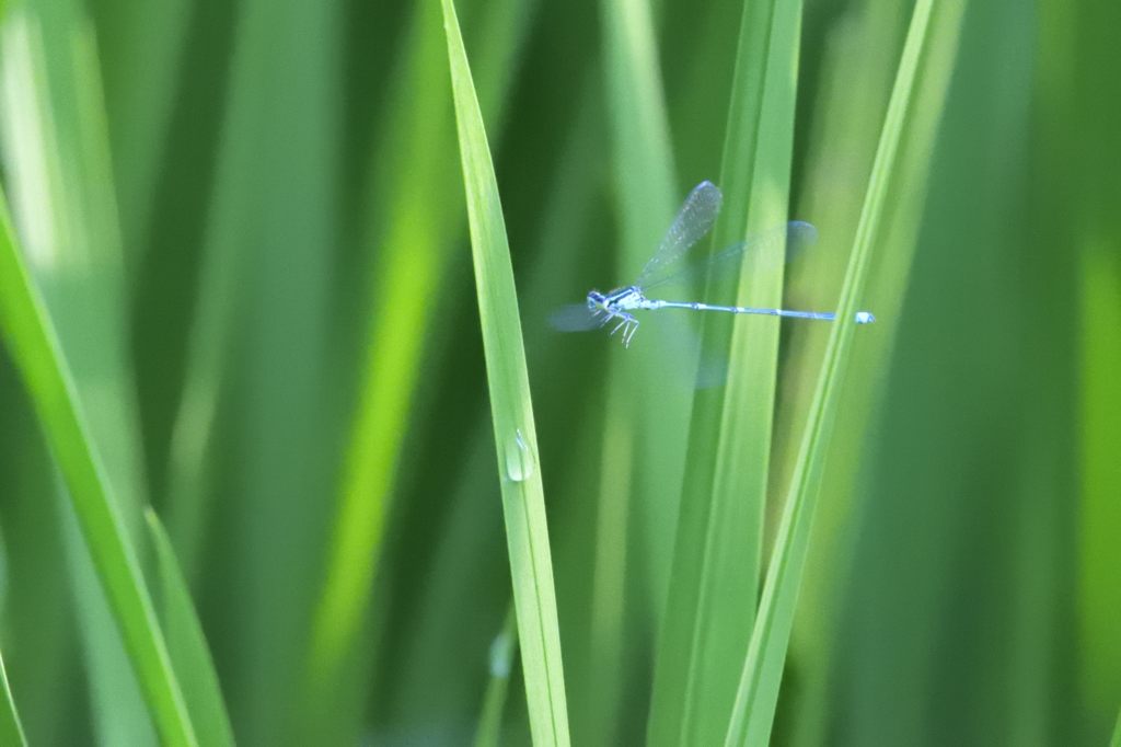 2024年に道北へ旅行した際の中継地、札幌市内で一泊した翌朝のこと。宿を立つ前の早朝に、カメラを持って近くの公園を散歩してみました。すると、池のほとりで非常に小さなイトトンボを見つけました。まだ陽が登りきらない時間帯で、相手が小さくて細いものですから目視はなかなか困難なくらい。姿を観察するというよりは、まるで影の揺らぎっぽいような見え方でした。
