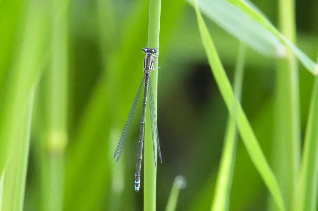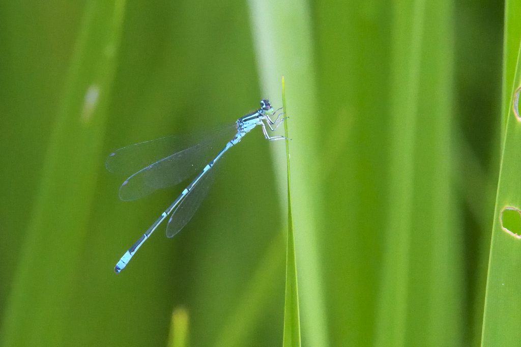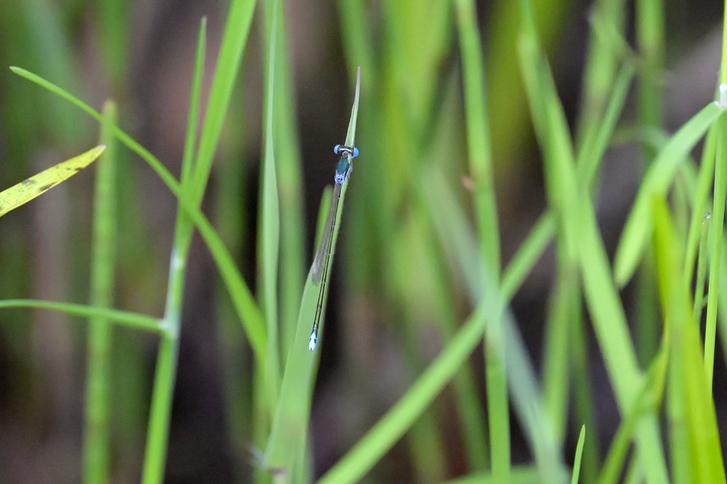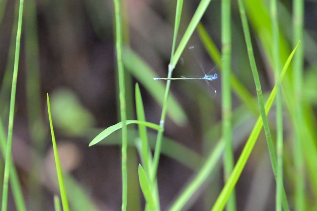 あらためてレンズを通してしっかり拡大してみると、腹の節の色目を見た感じルリイトトンボやエゾイトトンボみたいなブルー系のイトトンボです。一方で、自分の知るブルー系のイトトンボよりは、ざっと2まわりくらい小さくて華奢な印象でした。