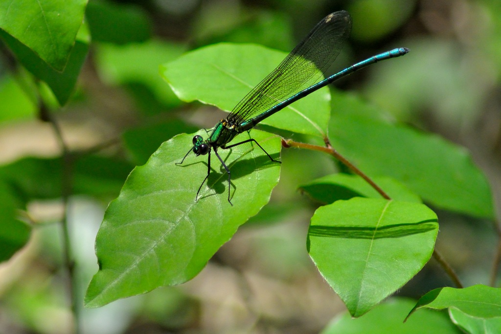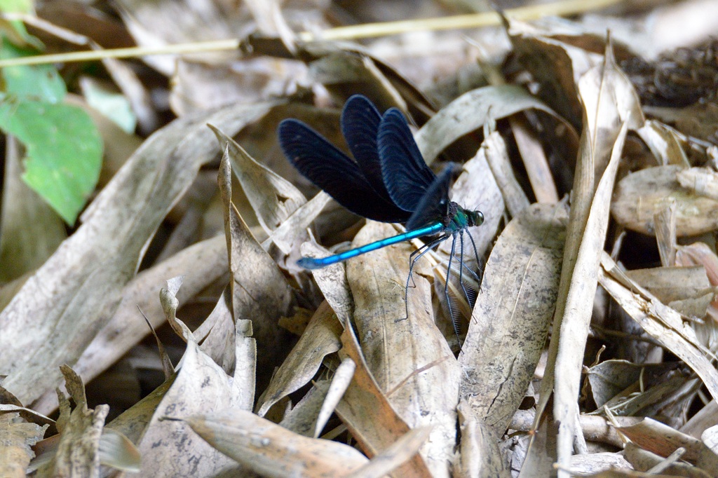 ハグロトンボは飛んでくると一旦羽を閉じて止まります。そして感覚的にはざっと10秒毎程度で、翅をゆっくり横に開いて、開ききった瞬間今度はぱっと素早く閉じます。夏の暑さをウチワで扇いでいるかのような動きなので、ハグロトンボを見ているとなんとなく涼しさを感じるものです。