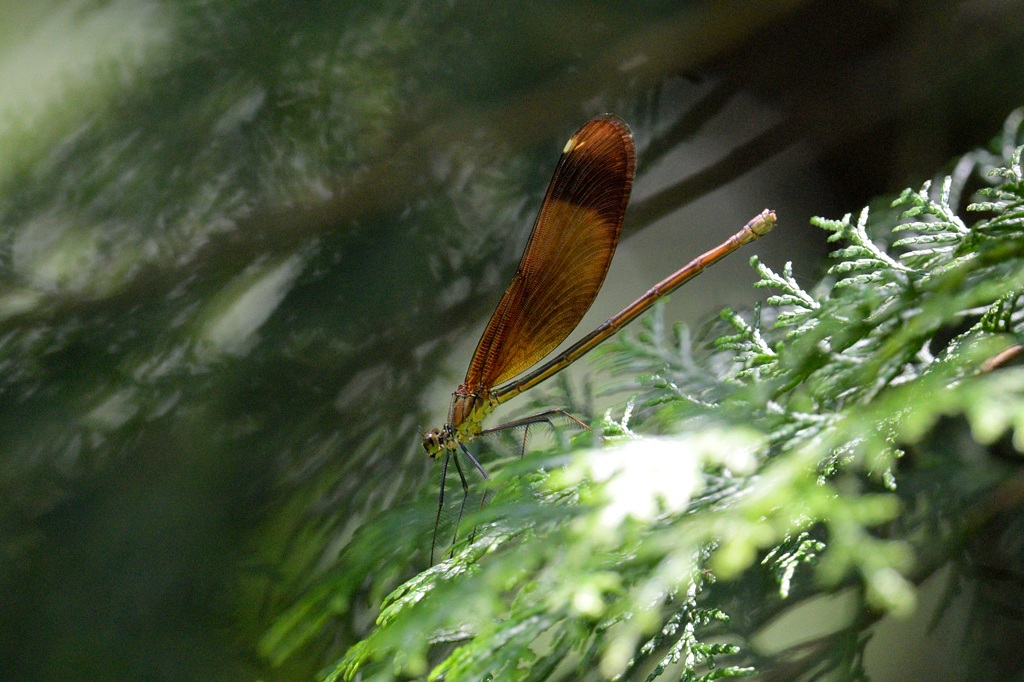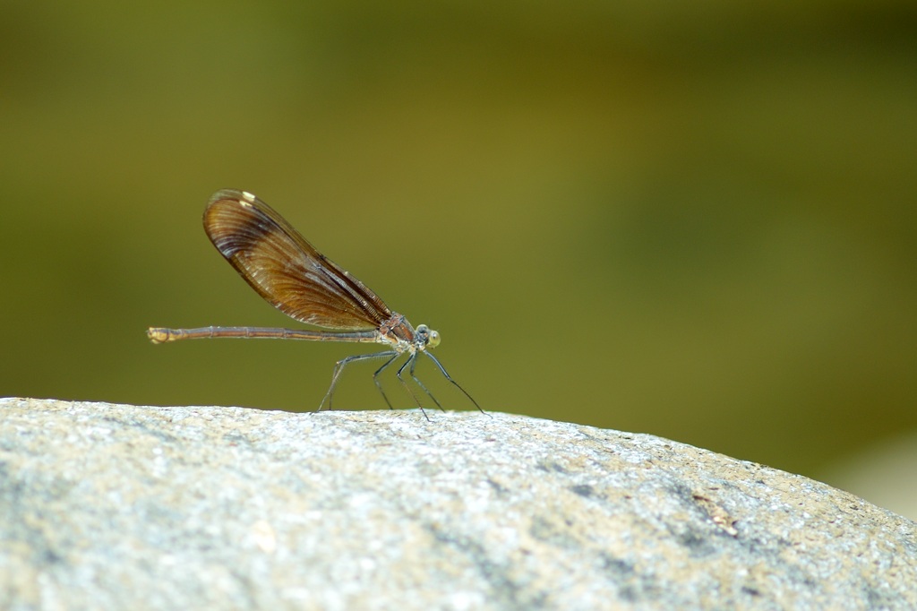 ミヤマカワトンボは名前の通り山の中の渓流沿いでよく見かけるカワトンボです。羽色は一色で茶色を基本に、先端手前に濃い茶色の大きな斑紋があります。サイズもカワトンボよりまだ大き目なため、よく目立つトンボです。観察するなら少し山に入って渓流沿いに歩き、川に大きな岩などがあればその岩の付近を探すと見つかりやすいと思います。