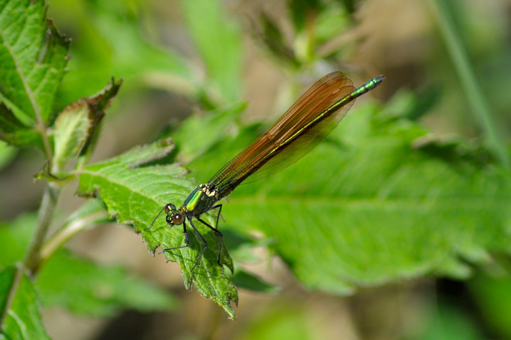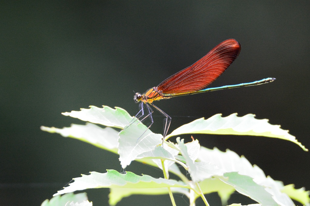 羽色は ♂ ♀ ともに同じ色目ですが、腹の色に関しては少し違います。♂ はハグロトンボやアオハダトンボのように青緑系の金属光沢をしていてきれいです。♀の方は茶色い感じで少し地味です。胴に関しては ♂ ♀ 共に赤銅色をしていて、少し輝く感じでこれもきれいです。