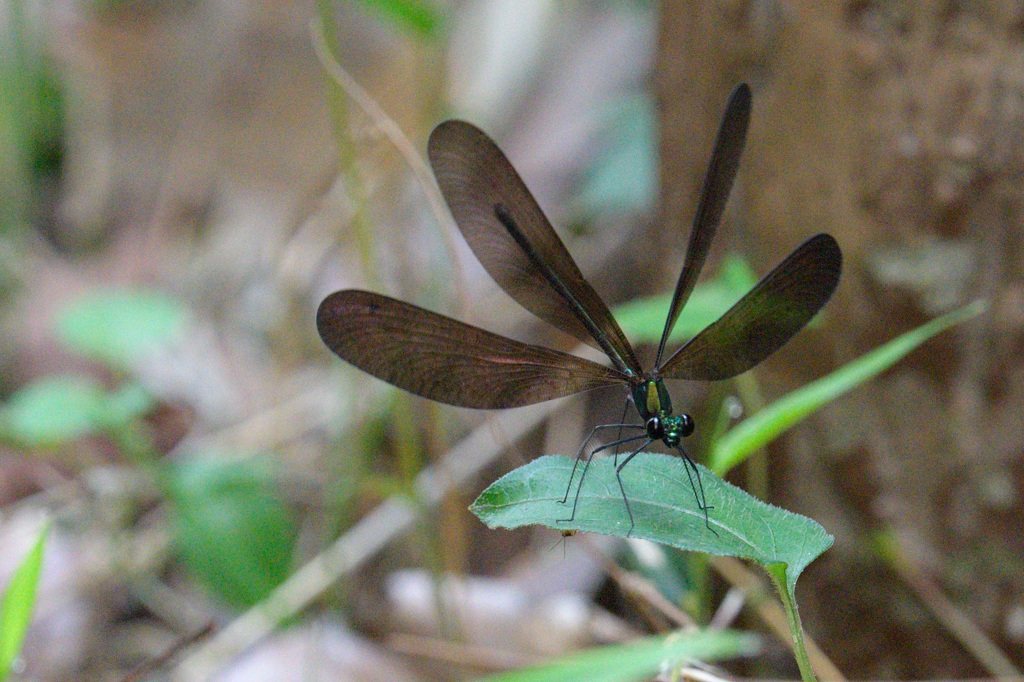 ここで紹介する絵は広島県の山の中にある湿地帯で撮りました。当然ながら「またハグロトンボかー!」と思って適当に撮っているので、絵も(バックも)しょぼいものしか残っていませんでした。残念。なお、この個体が「ハグロトンボ」ではなくて「アオハダトンボ」だという確証については、自信のほどおよそ60%くらいです。ぼやけていますが、腹先端の下側が白く見えるのと、翅が太く丸みを帯びて見えるあたりで判断しています。
